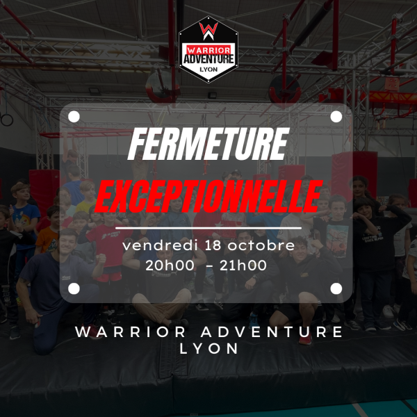 Nous tenons à informer nos membres qu’en raison d’un pot de vacances, notre salle sera exceptionnellement fermée le vendredi 18 octobre de 20h à 21h. Cet événement est réservé à nos adhérents ninja, un moment de convivialité pour célébrer ensemble les exploits de cette année et préparer de nouvelles aventures passionnantes.