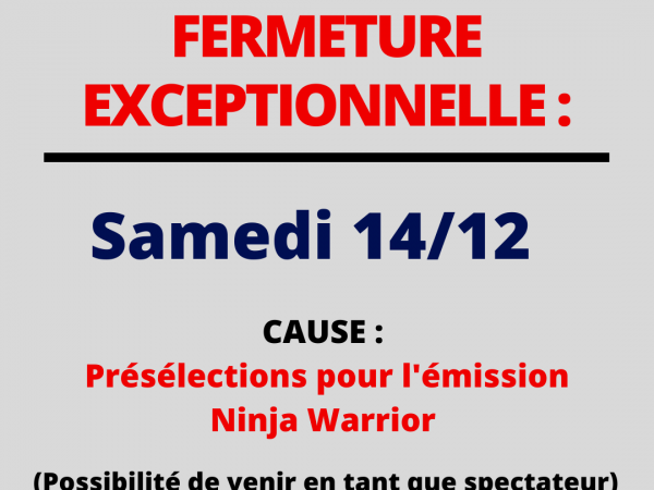 Pour organiser au mieux les présélections, votre structure sera exceptionnellement fermée le 14 Décembre MAIS pour ceux qui souhaiteraient voir comment se passent les présélections, ou tout simplement pour encourager les participants, nous resterons tout de même ouvert afin que vous puissiez venir en tant que spectateurs.