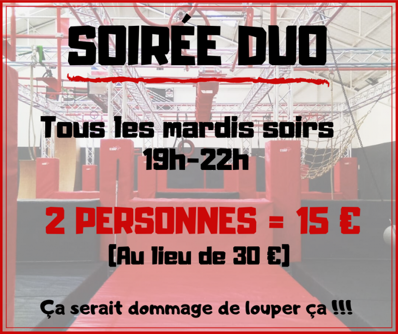 Il te suffit donc de venir tous les mardis soir, à partir de 19h et jusqu'à 22h pour ainsi profiter de l'offre spéciale "soirée duo" en venant accompagné de ton/ta pote, ton/ta collègue, ton frère, ta sœur, ta mère, ton père...